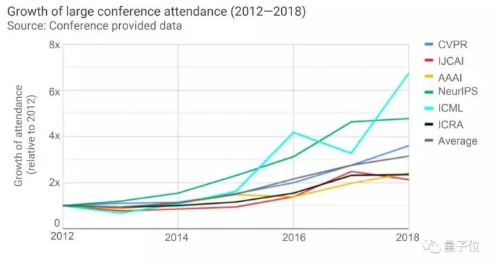 在大型会议中,NeurIPS (曾用名NIPS) 、CVPR和ICML,是参与人数最多的三大AI会议。自2012年以来,论参与人数的增长率,这三者也领先于其他会议。