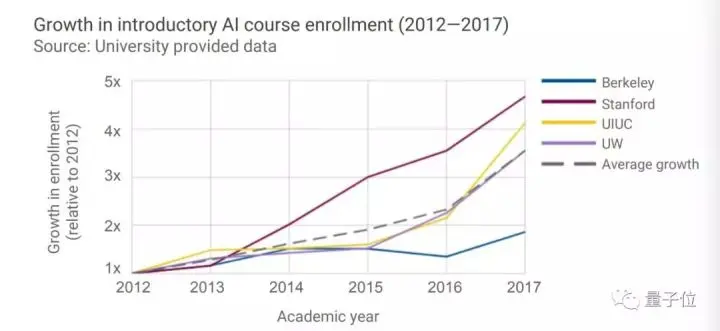 报告显示,截止到2017年底,AI课程注册人数是2012年的3.4倍,ML课程注册人数是2012年的5倍。