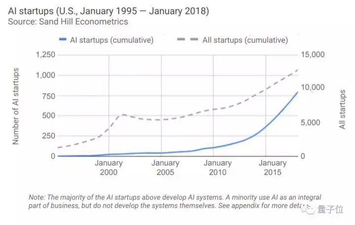 从2015年1月到2018年1月,人工智能创业公司的数量增长到了原来的2.1倍,而所有活跃的创业公司增长到了原来的1.3倍。