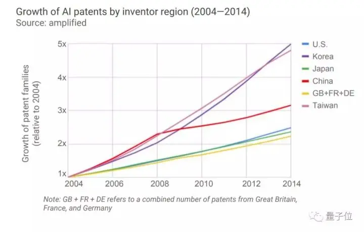 在韩国和中国台湾地区,专利的增长速度较快。2014年人工智能专利的数量几乎是2004年的5倍。