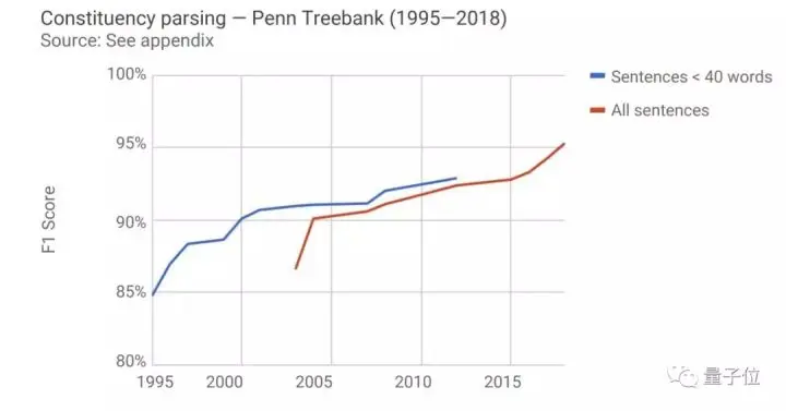在确定句子结构这种语法分析的任务上,2003年到2018年的15年间,AI的表现(F1 Score得分)提升了将近10%。