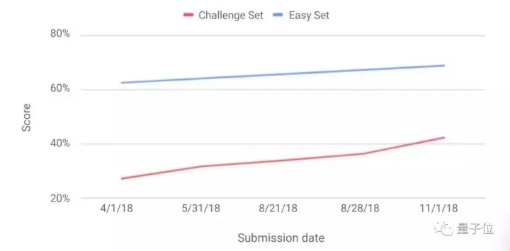 报告统计了2018年从四月到11月间,AI在ARC推理挑战赛上成绩的变化:简单组得分从63%提升到69%,挑战组得分从27%提升到42%。