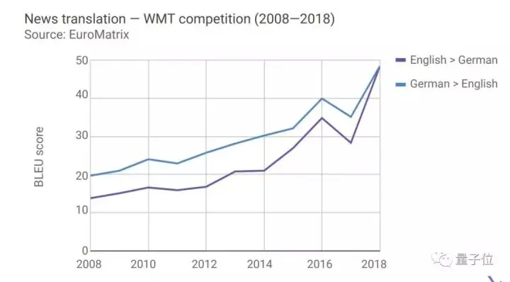 报告显示,2018年英语转德语的BLEU评分是2008年的3.5倍,德语转英语成绩是2008年的2.5倍。