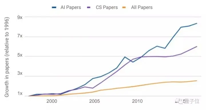 从1996年到2017年,CS领域的年发表论文增长了约五倍 (6x) ,AI领域的年发表论文增长了约七倍 (8x) 。对比一下,所有学科的年发表论文总量增长了不到两倍 (<3x) 。