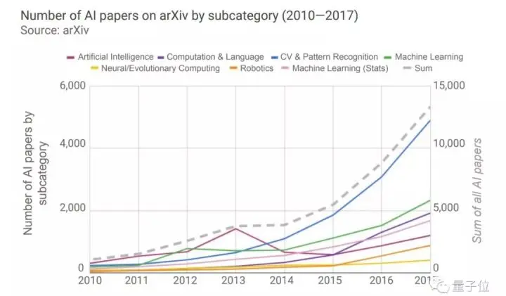 自2010年以来,arXiv论文总体呈现迅速增长,从2010年发布的1,073篇,到2017年发布的13,325篇,增长超过11倍 (12x) 。许多细分领域也呈现增长。