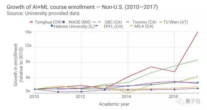 报告进一步统计了非美国地区院校AI+ML课程注册人数的变化。结果显示,清华是非美国院校外增长率最高的高校,几乎是第二名多伦多大学的2倍。