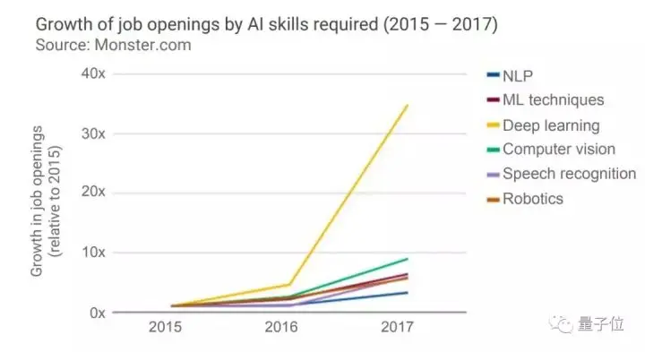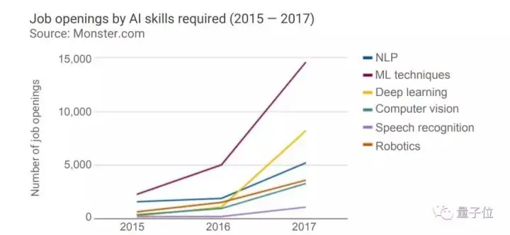 报告统计,2017年,全球ML人才需求是2015年的35倍,从2016年到2017年的增幅尤为明显。全球对AI人才的需求在2016年骤增。
