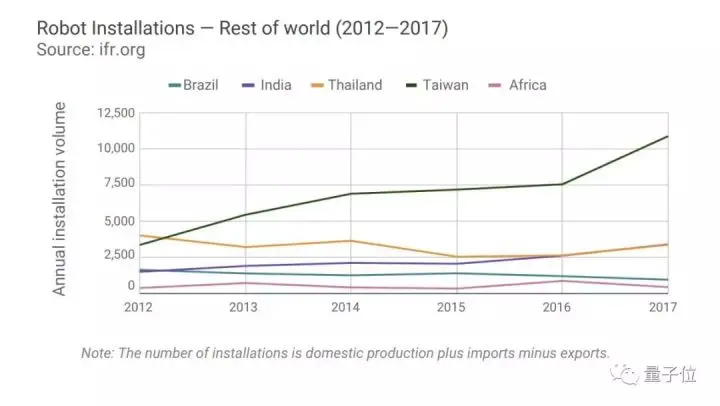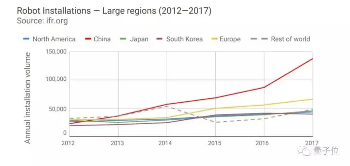 2012年到2017年,中国机器人年安装量增长了500%,其他地区,比如韩国和欧洲,分别增长了105%和122%。