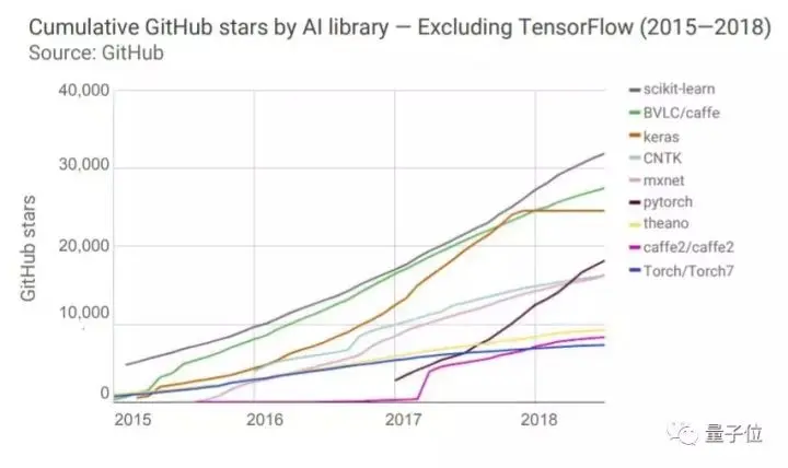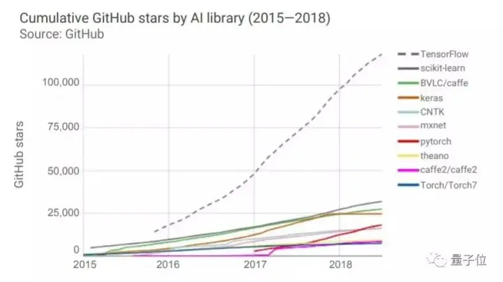 我们可以明显发现,TensorFlow的受欢迎程度在开发者中遥遥领先、稳步增长。