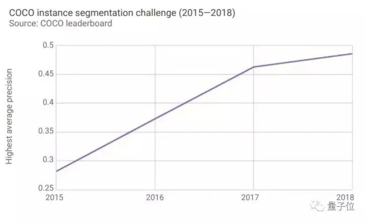 四年来,COCO数据集上图像分割挑战的精确度已经提升了0.2,2018年的成绩比2015提升了72%。不过,目前还没有超过0.5,这一项还有充足的进步空间。