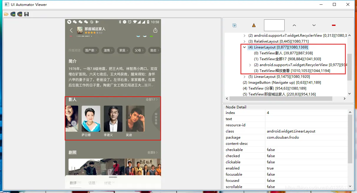 uiautomatorviewer.bat 工具中可以分析出,豆瓣是通过自定义 LinearLayout 来实现的,包含了横向的 RecyclerView 与右侧的 释放查看TextView 文本子控件。那么 弹性滑动控件 实现的大概思路如下:RecyclerView 滑动到左右边缘,记录 x 轴方向的偏移量,通过方法 setTranslationX 设置 RecyclerView 的平移量,手指抬起则执行简单的平移动画,接下来会详细讲解,比较乏味,请系好安全带。