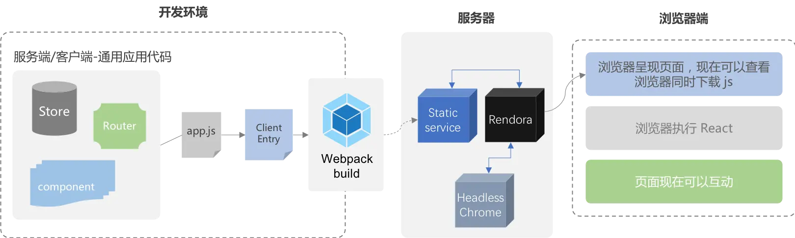 具体使用方法,可以看我最近造的个轮子 kkt-ssr,这个轮子将工具的部分封装起来,你只需要写业务代码,和少量的服务端渲染代码即可,还附赠十几个示例,加上一个相对比较完善的示例react-router+rematch,类似于 next.js,但是有相当大的区别。