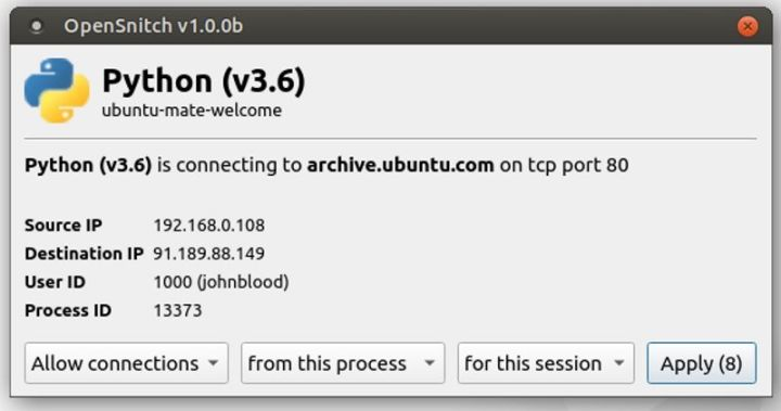 然后,我转到 Ubuntu Mate 上安装 OpenSnitch,因为安装介绍就是针对 Ubuntu 所写的,进展很顺利。但是,我遇到了几个问题。我调整了一下上面介绍的安装过程以解决我遇到的问题。