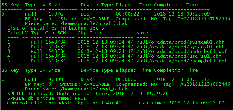 可以看到备份5包括的是数据文件,备份6包括的是控制文件和参数文件。