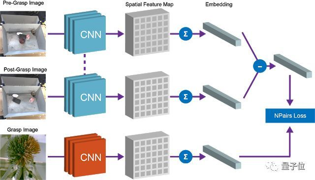 这个差值向量和被抓取对象的相应向量表征,通过N配对目标(N-pairs object)归于等价。