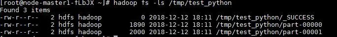 sc.parallelize(range(1000)).saveAsTextFile("/tmp/test_python3")再开一个窗口,命令行中执行 hadoop fs -ls /tmp/test_python,对应目录有输出则配置成功