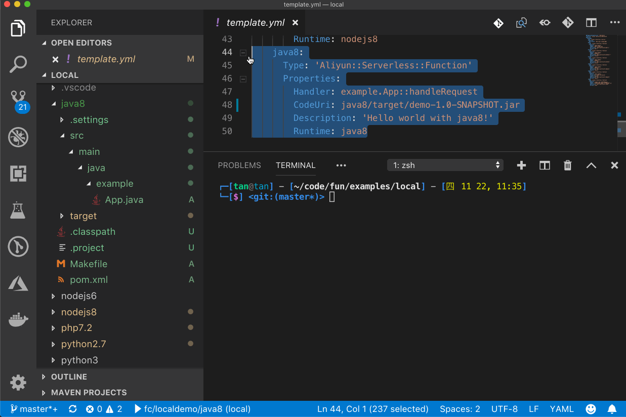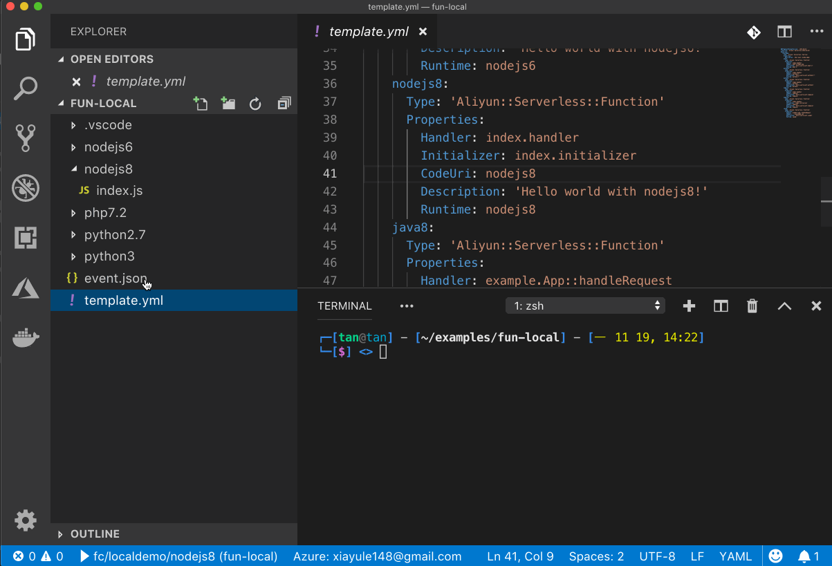 └── template.ymltemplate.yml 定义了函数计算模型,其中定义了一个名为 localdemo 的服务,并在该服务下,定义了 6 个函数,名称分别是 nodejs6、nodejs8、php72、python27、python3、java8。它们对应的代码目录由 template 中的 CodeUri 定义,分别位于 nodejs6、nodejs8、php7.2、python2.7、python3、java8 目录。