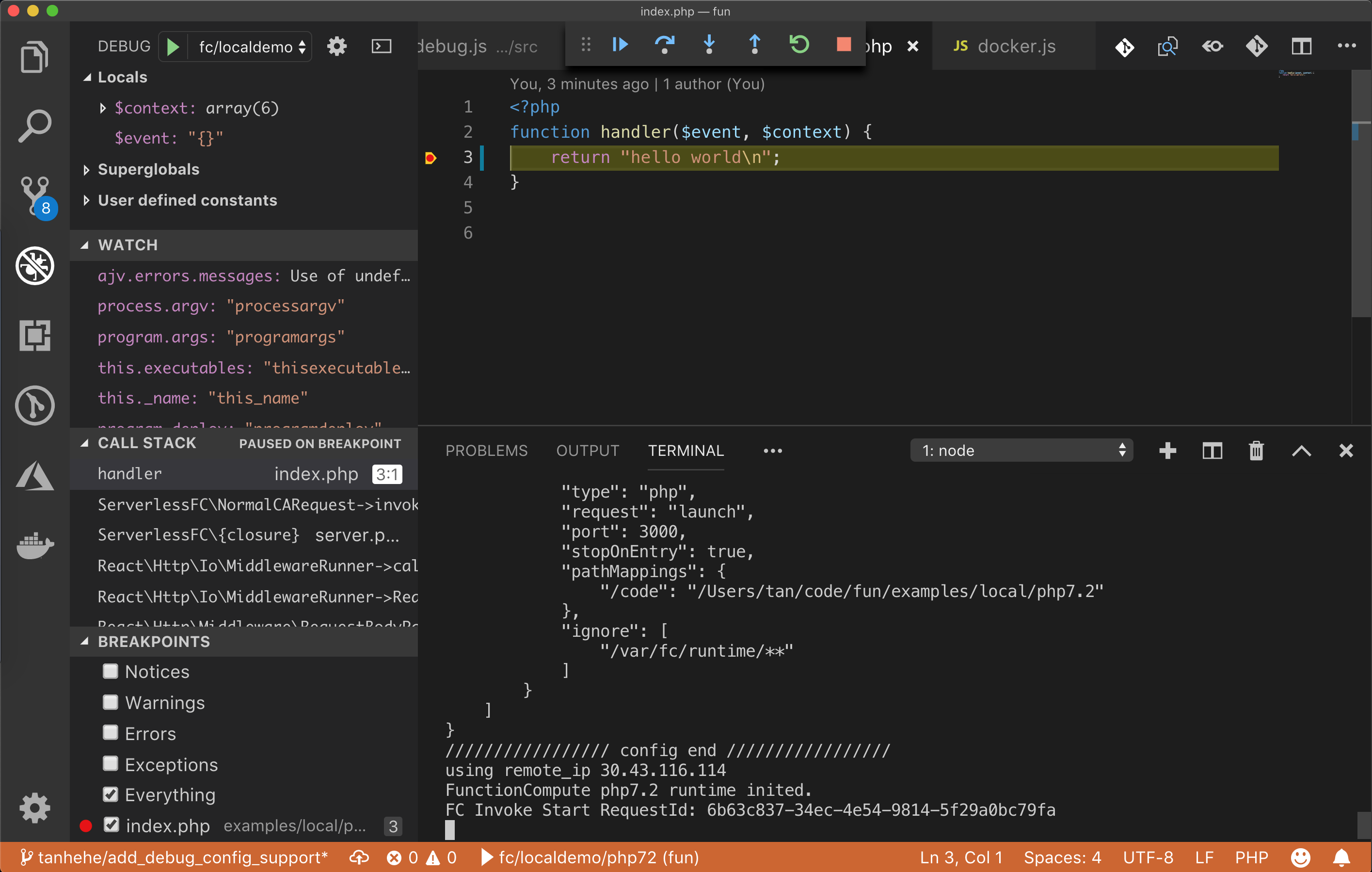 fun local invoke -d 3000 --config VSCode php72但不同的是,以 debug 方式运行 php 函数后,php 函数并没有阻塞等待 vscode 调试器的连接,而是直接运行结束。