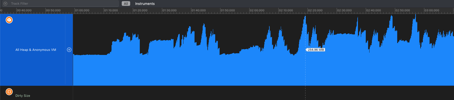 上图所示,使用一开始比较经典的对比,有突刺的是滑动下载和加载图片的时候最高在115%CPU使用率。在1分钟到1分30秒区间中是滚动在已经下载好的图片,平均在18%左右的使用率。和Flutter 对比静止和滚动时候其实都是iOS原生好点。