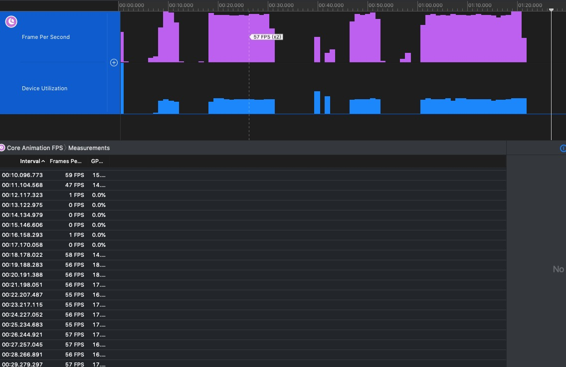 iOS原生滚动的时候,这是使用SDWebImage处理结果大约都在57fps以上。GPU使用率比Flutter低,还需要优化,不过还有一个问题,Flutter静止图像的时候还会使用GPU,而原生在静止时候,就不会使用GPU了。