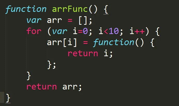 大家看一下上面这个代码,arr数组中包含了10个匿名函数,每个匿名函数都能访问外部函数的变量i,那么i是多少呢?