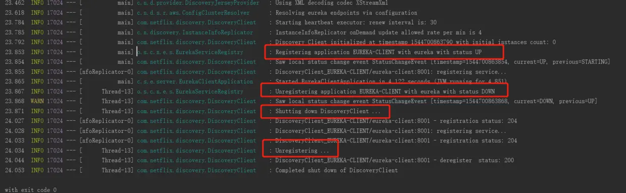 看上面的日志可以观察到,服务最开始是有正常注册到eureka注册中心的,但是紧接着会发现。Unregistering application EUREKA-CLIENT with eureka with status DOWN,后面接着 Shutting down DiscoveryClient ... 最后 Unregistering ...。