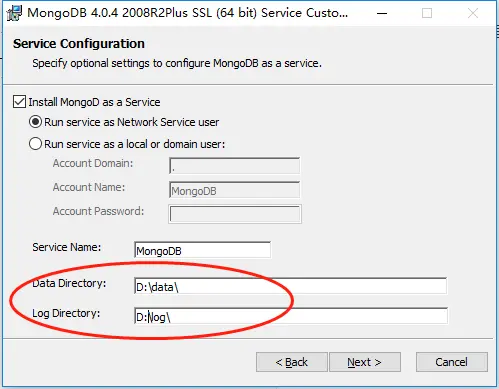 默认数据和日志放在C盘Mongo文件夹里,此处可以自定义,但必须放在C盘或者D盘的根目录下,一开始我放在了D:\mongodb\data\和D:\mongodb\log\目录下,结果可以安装成功但是服务启不起来,所以只能改为D:\data\和D:\log