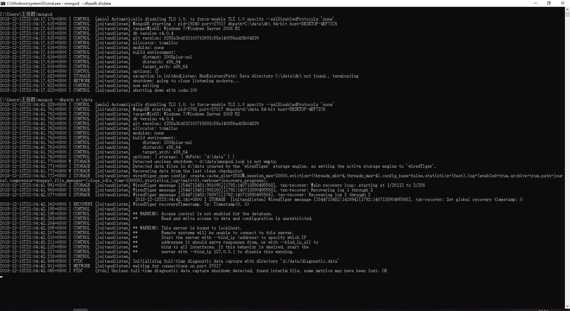 说明已经启动成功了,在cmd中输入mongo就可以进入数据库并进行后面的操作了,但如果把mongod服务停掉重新启动时,输入mongod会报错,因为自定义了数据库和日志地址,mongod访问不到,所以要mongod.exe --dbpath d:\data才能启动成功
