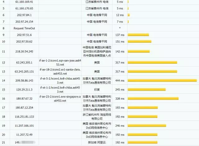 电信联通都不怎么好,平均值都上200ms了,移动线路很不错,看下具体的路由图: