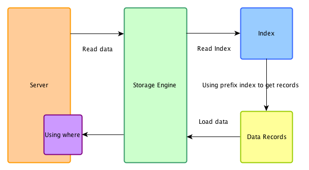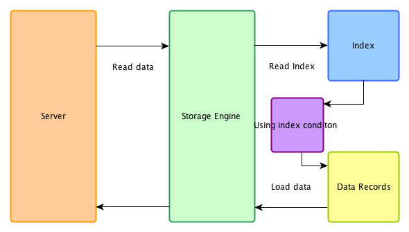 存储引擎使用索引过滤不相关的数据,仅返回符合 index condition 条件的数据给 server 层。也是说数据过滤尽可能存储引擎层进行,而不是返回所有数据给 server 层,然后后再根据 where 条件进行过滤。