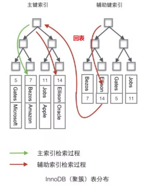 这样在用辅助索引进行查询时,会先查出主键的值,然后再去主索引中根据主键的值查询目标值。
