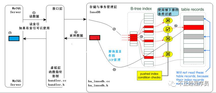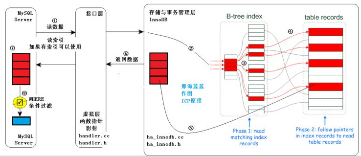 也不是全部 where 条件都可以用 ICP 筛选,如果某 where 条件的字段不在索引中,当然还是要读取整条记录做筛选,在这种情况下,仍然要到 server 端做 where 筛选;