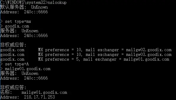 - 查找goodix.com的权威名称服务器(如果挂在dnspod上,则会给出dnspod的服务器地址)