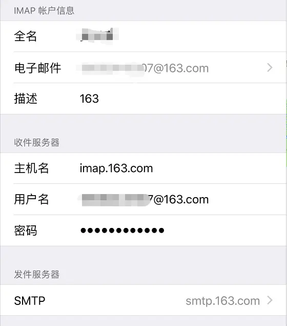 绕了这么多,终于回到了正题,其实如果真正弄懂了邮件传输的原理以及相关一些协议的作用,这样就比较简单了。 如下图,收件服务器采用可以与服务器进行交互的IMAP协议,毕竟比较有优势,也可以查看163的网站查看主机名为imap.163.com,而发送服务器没得选,直接写smtp.163.com就可以了,这里的端口后不需要填,基本上都是默认的端口号。