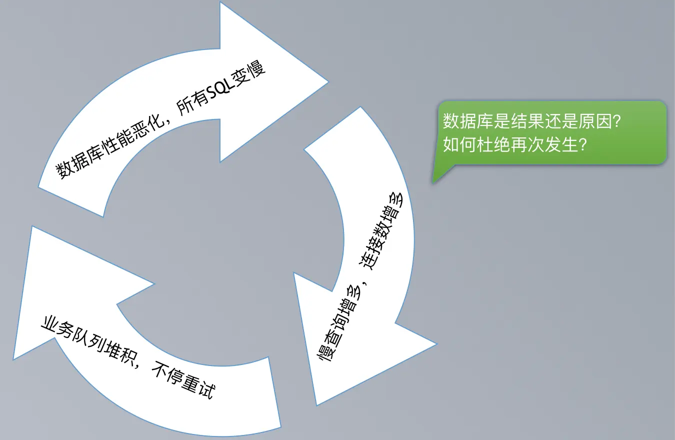 通常来讲,故障的轨迹是一个链,但也可能是一个“多米诺骨牌”的连环。可能因为一些原因导致SQL执行变慢,引起连接数的增长,进而导致业务超时,而业务超时又会引发业务不断重试,结果会产生更多的问题。当我们收到一个报警时,可能已经过了30秒甚至更长时间,DBA再去查看时,已经错过了最佳的事故处理时机。所以,我们要在故障发生之后,制定一些应对策略,例如快速切换主库、自动屏蔽下线问题从库等等。除此之外,还有一个比较难的问题,就是如何避免相似的故障再次出现。