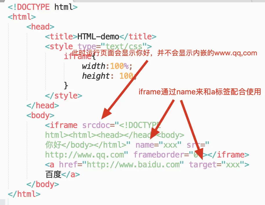 width可以是使用百分比或者像素,height只能是像素. name, 通常与a标签结合使用.src, 一般都是网址src="http://www.baidu.com", 也可以是相对路径src="./index.html", 嵌套空白页src="about:blank"或者是src="#"sandbox, 如果指定了空字符串,该属性对呈现在iframe框架中的内容启用一些额外的限制条件。属性值可以是用空格分隔的一系列指定的字符串, 比如:sandbox="allow-forms"