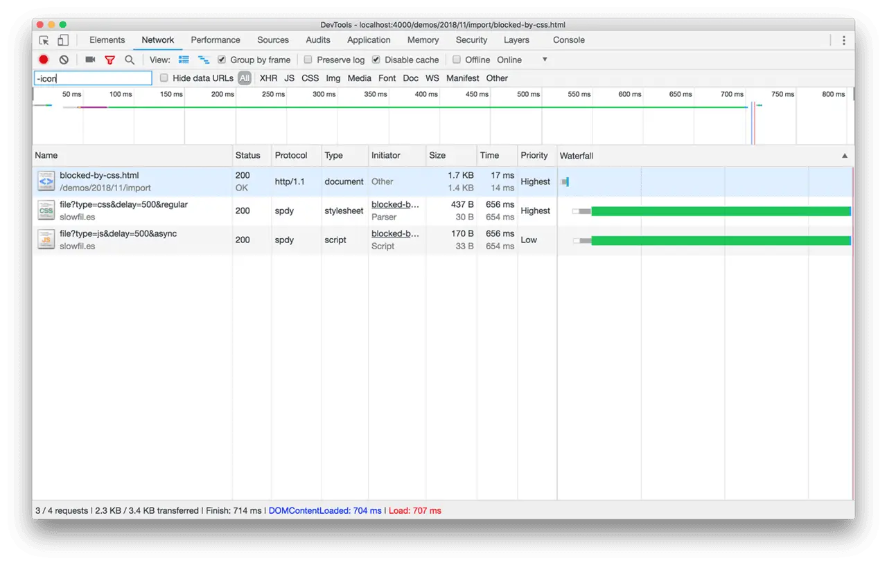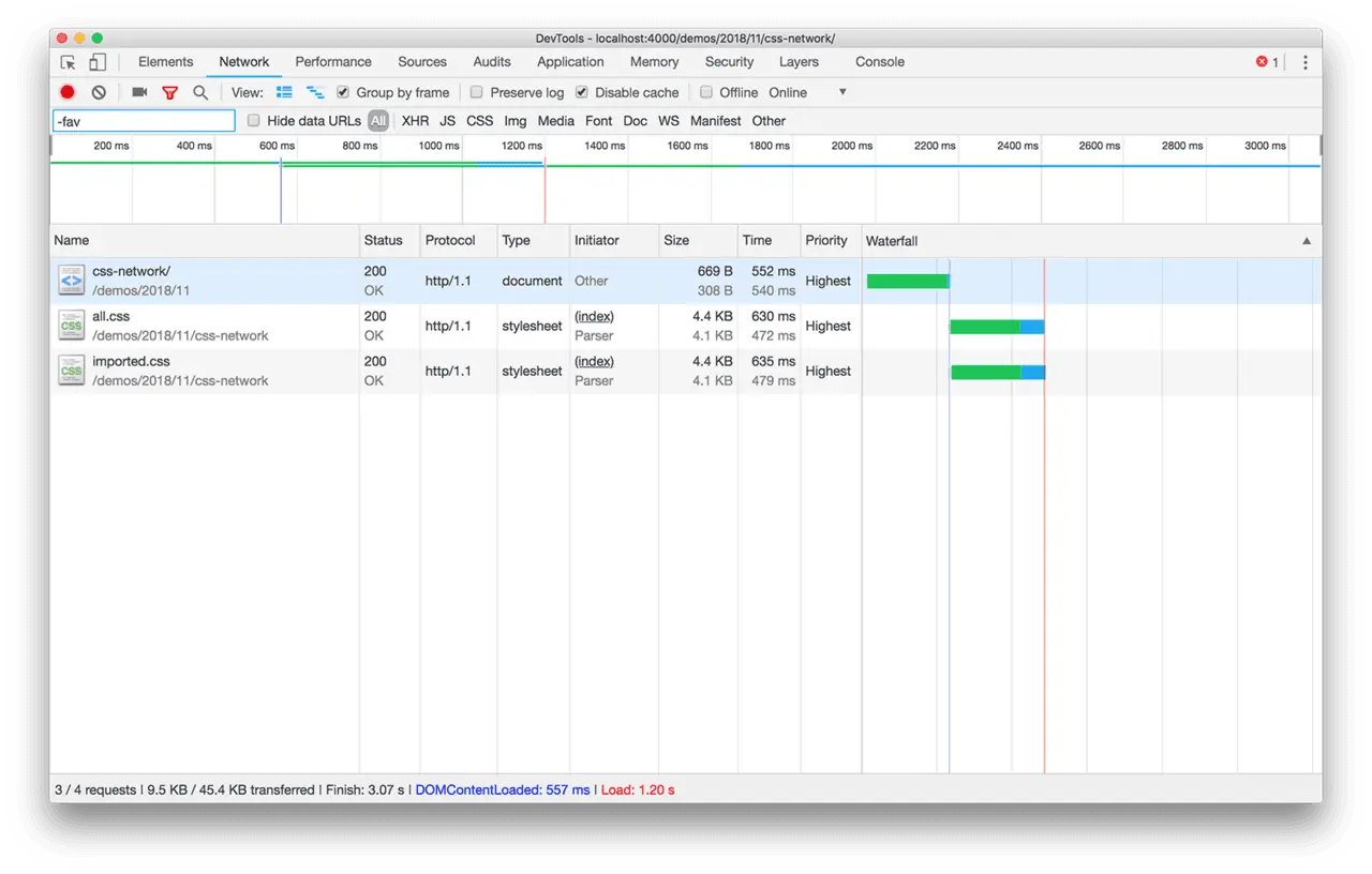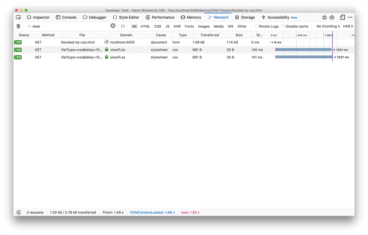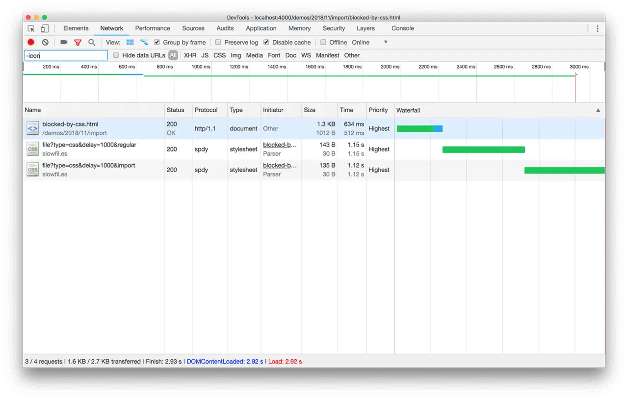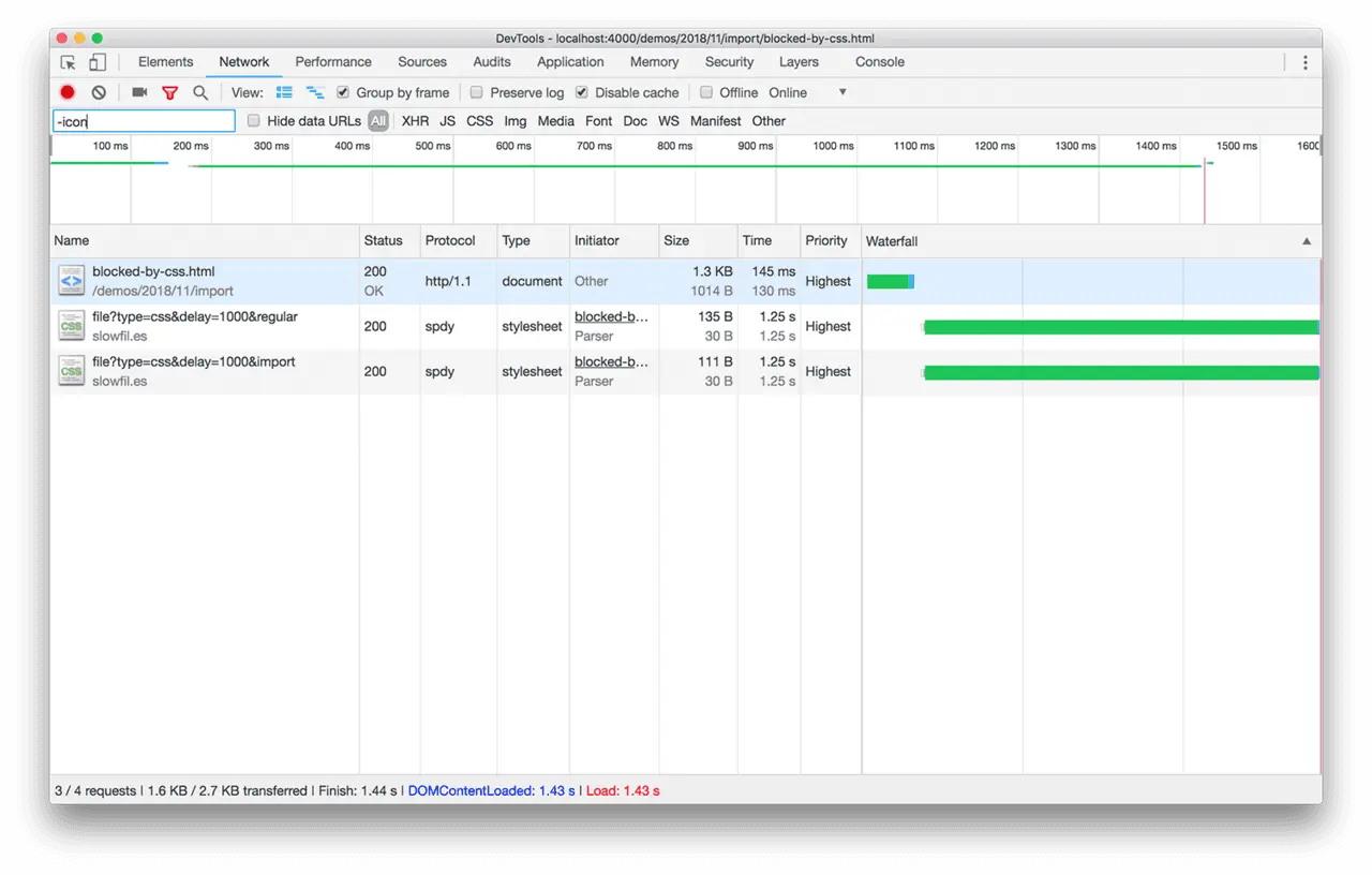 通过上图,可以清晰地观察到:直到 JavaScript 文件下载完成之后,@import 引用的 CSS 文件才开始下载。