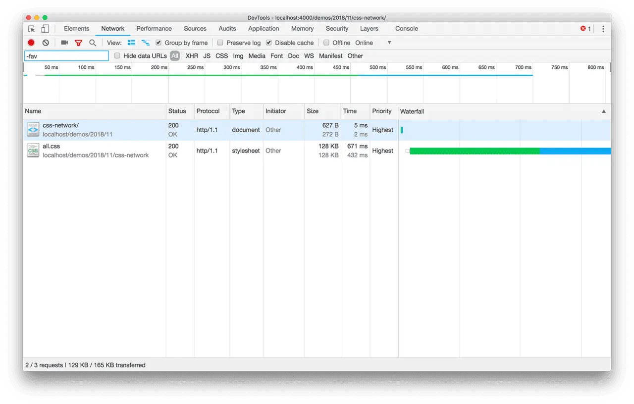如果我们把全部的 CSS 代码都放在一个文件中,请求的表现如下: