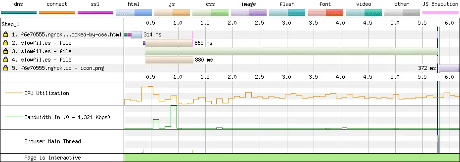 根据这现象,CSS 文件的下载时间会对后续 <script> 的执行时间造成影响。下面的例子能较好地说明问题。