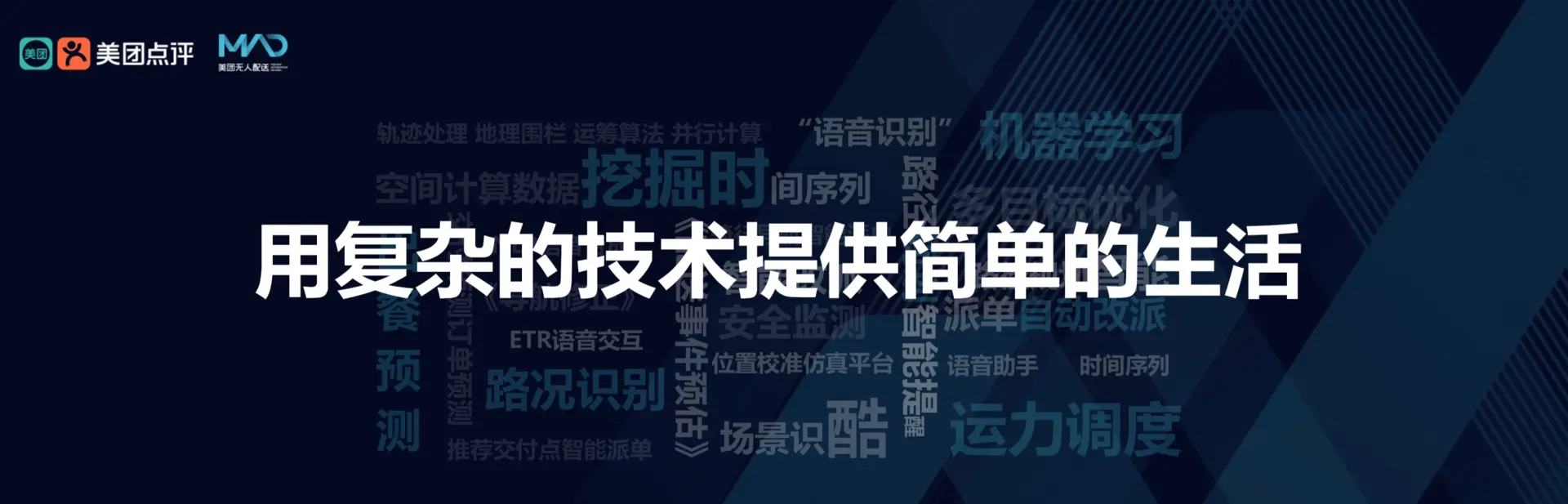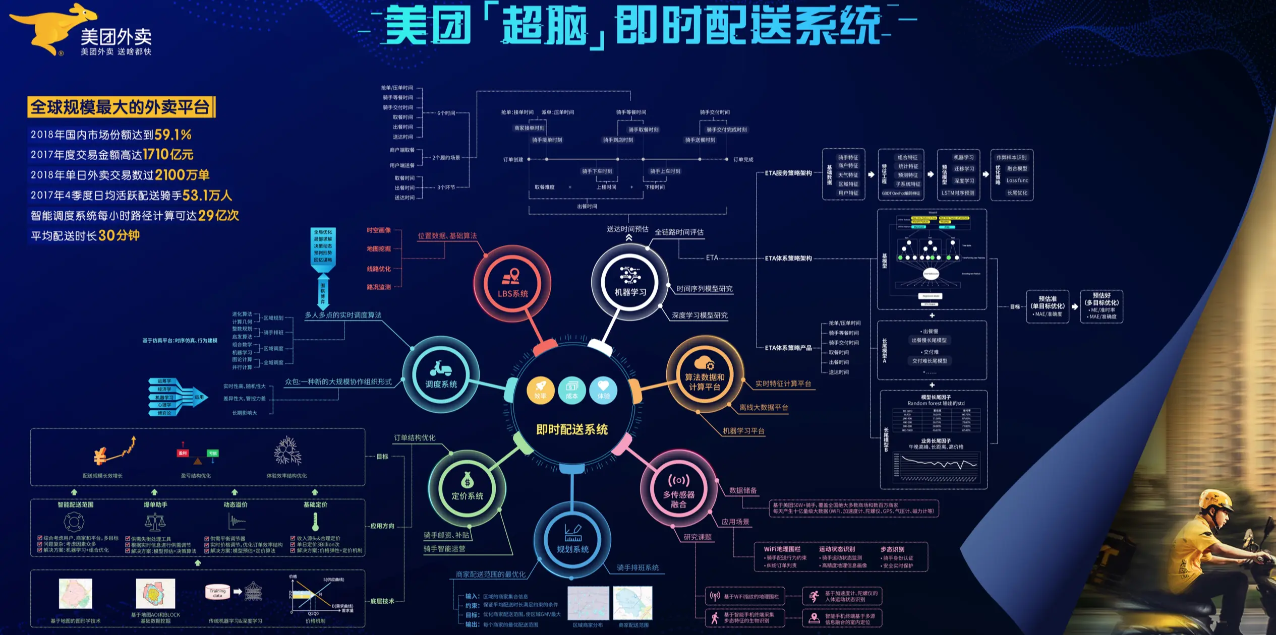美团外卖日订单量超过2400万单,已经占有了相对领先的市场份额。美团配送也构建了全球领先的即时配送网络,以及行业领先的美团智能配送系统,智能调度系统每小时路径计算可达29亿次。如何让配送网络运行效率更高,用户体验更好,是一项非常困难的挑战,我们需要解决大量复杂的机器学习和运筹优化等问题,包括ETA预测,智能调度、地图优化、动态定价、情景感知、智能运营等多个领域。过去三年来,美团配送AI团队研发效果显著,配送时长从一小时陆续缩短到30分钟,并且还在不断提升,我们也希望通过AI技术,帮大家吃得更好,生活更好。