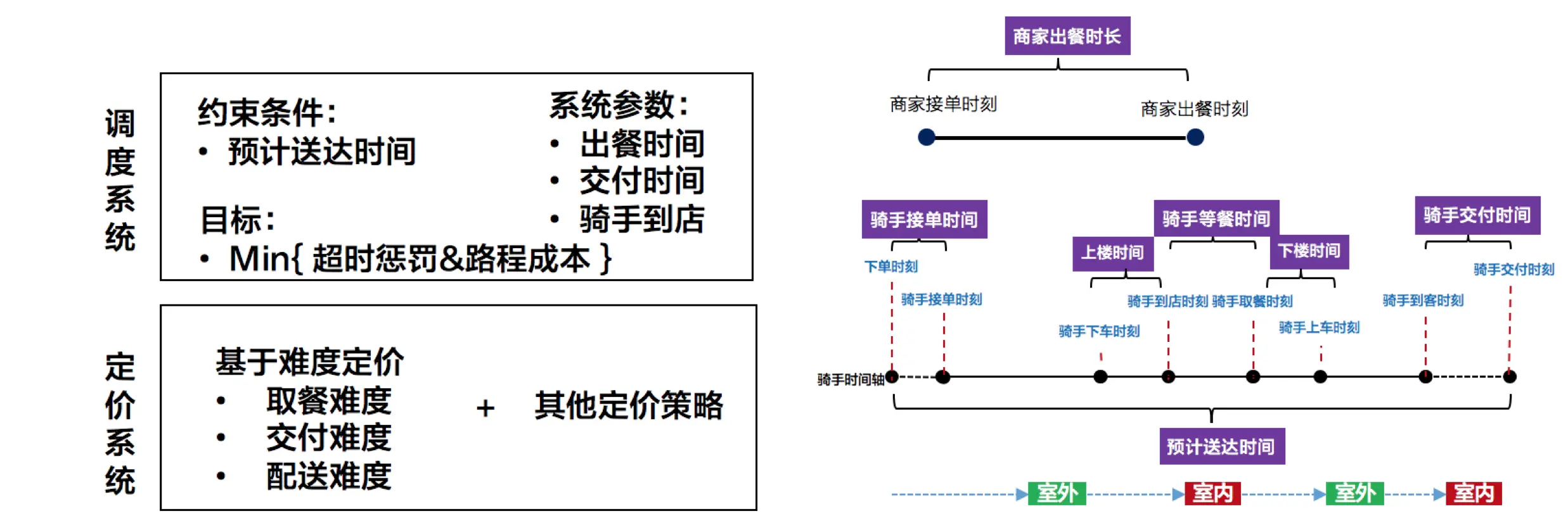 一个订单中涉及的各种时长参数(如上图右侧所示),可以看到有十几个关键节点,其中关键时长达到七个。这些时长涉及多方,比如骑手(接-到-取-送)、商户(出餐)、用户(交付),要经历室内室外的场景转换,因此挑战性非常高。