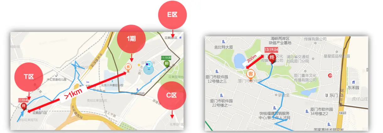上图左,一个小区会有1期2期~N期等,用户在选择POI的时候就可能发生错误(比如1期的选了2期),两者地理位置相差非常远,很容易造成骑手去了错误的地方。这样在订单发送到配送系统的时候,我们需要做一次用户坐标纠正,引导骑手到达正确的位置。
