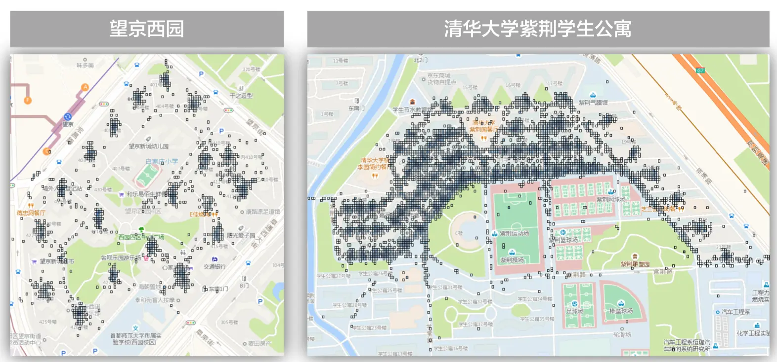 - 上图右侧部分看到,我们挖掘的交付点基本上能与楼宇的单元门对应。而且没有明显偏差比较大的部分。这个质量基本达到我们之前设定目标,也证明配送大数据的巨大潜力。