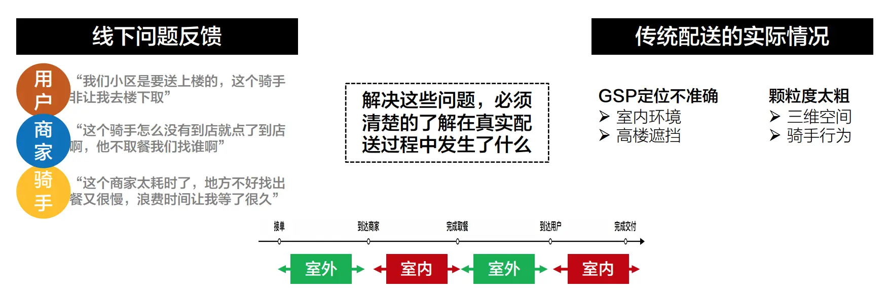 前面提到的地图技术,只能解决在室外场景的位置和导航问题。但配送在商家侧(到店、取餐)和用户侧(到客、交付)两个场景中,其实是发生在室内环境。在室内的骑手位置是在哪里、在做什么以及用户和商家在做什么,如果了解这些,就能解决很多实际问题。比如:
