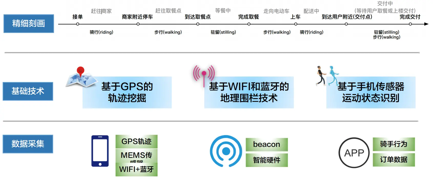 - 骑手在配送过程中经常会切换方式,比如可能某个小区不让骑电动车,那骑手必须步行,再比如骑手在商家发生长时间驻留,那应该是发生了等餐的情况(用户侧同理)。目前,我们选择使用基于传感器的运动状态识别作为主要辅助。