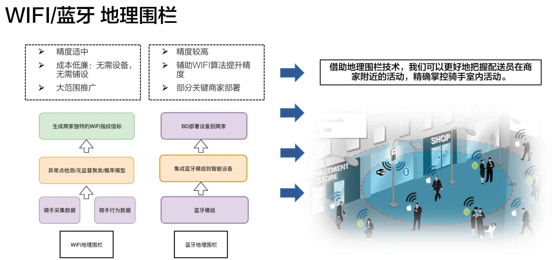 - 在ETA预估中已经展示过一些,不过之前主要还是基于骑手上报数据,这显然无法做到很高精确,必须引入更客观的数据进行描述。目前,我们选择的是WIFI和蓝牙的地理围栏技术作为主要辅助。