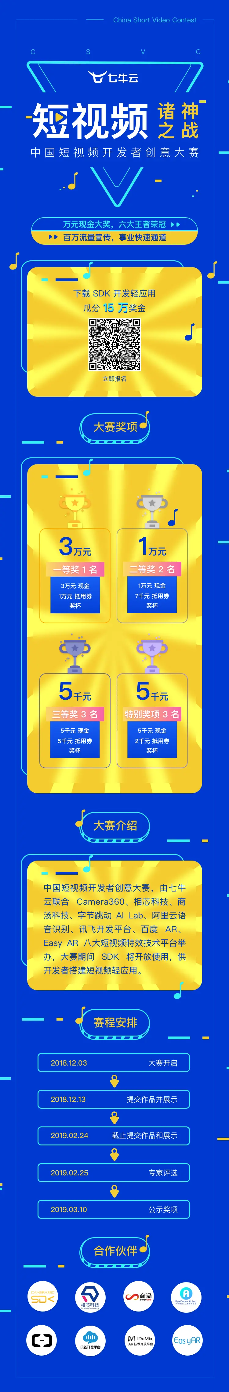 本次大赛将由七牛云联合 Camera360、相芯科技、商汤科技、今日头条 AI Lab、阿里云智能语音交互、讯飞开发平台、百度 AR、EasyAR 等八大短视频特效技术平台,为开发者提供免费开放的短视频 SDK,不仅能完成基本处理和特效处理,还包含上百种丰富功能,开创短视频新玩法,让你大开脑洞玩转短视频。