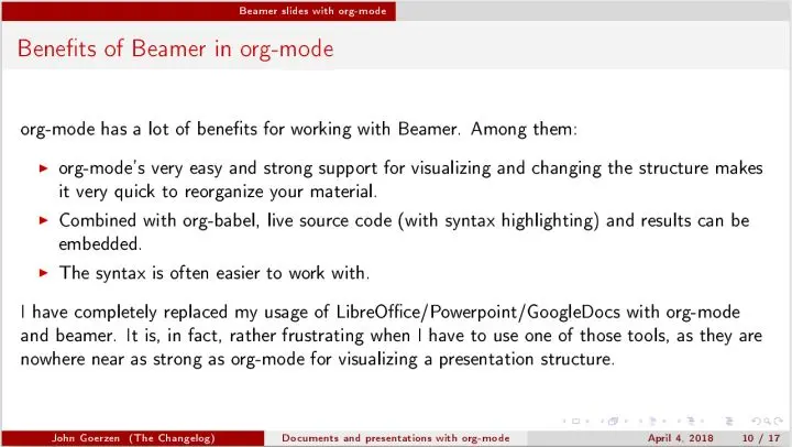 我已经完全用 Org 模式和 beamer 替换掉使用 LibreOffice/Powerpoint/GoogleDocs。事实上,当我必须使用其中一种工具时,这是相当令人沮丧的,因为它们在可视化表示演讲稿结构方面远远比不上 Org 模式。