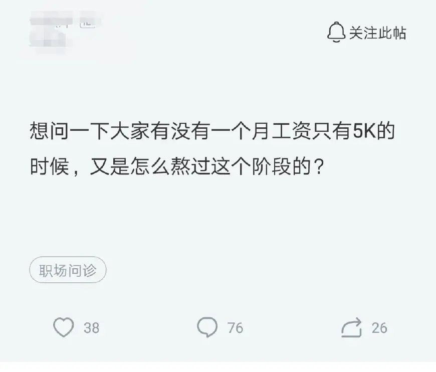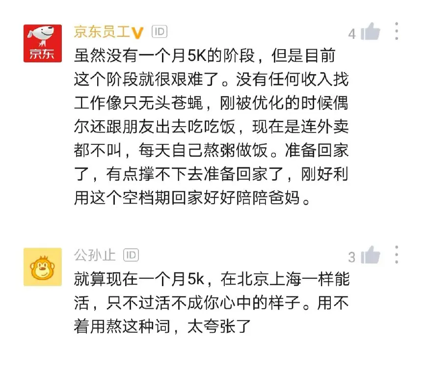 虽然没有一个月5K的阶段,但是目前这个阶段就很艰难了。没有任何收入找工作像只无头苍蝇,刚被优化的时候偶尔还跟朋友出去吃吃饭,现在是连外卖都不叫,每天自己熬粥做饭。准备回家了,有点撑不下去准备回家了,刚好利用这个空档期回家好好陪陪爸妈。