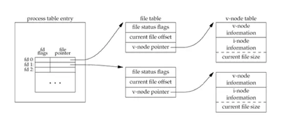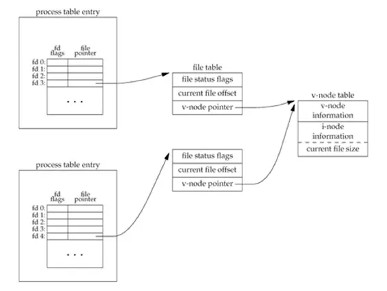 这里进程A的fd3和进程B的fd4其实指向的是同一个实体文件,但是这两个进程维护了两张不同的文件表,维护了不同的offset位置。所以如果进程不是采用append方式写文件,两个进程写入的内容可能出现相互覆盖。这里也可能看到虽然FD不同,但是可以指向同一个实体文件,也说明了用FD来判断文件唯一性是不靠谱的。